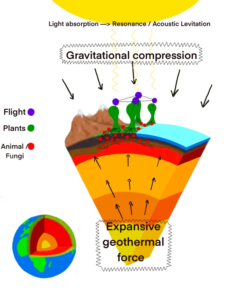 What makes life unique is simple, yet profound: You still have the basic concept in which heat energy is creating a force pushing life upward and out of the earth (for now, everything will be a blob, with the geometry coming later). However, what makes life special is the process of light absorption from above, and the conversion of that energy into resonance, a process that allows life to quite literally defy gravity through vibration.